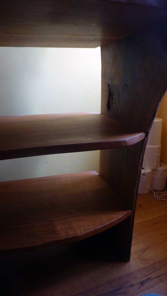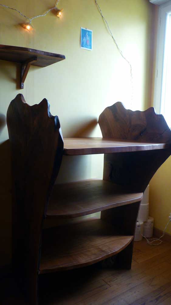 La fabrication de ce meuble à langer s’inscrit dans une démarche d’ébénisterie d’art. Les joues ont été réalisées en loupe de noyer massive. Les chants bruts ont été poncés tout en conservant la forme organique de l’arbre. Le débit des pièces a été sélectionné directement dans la bille de bois afin d’obtenir une symétrie parfaite des formes et du veinage.