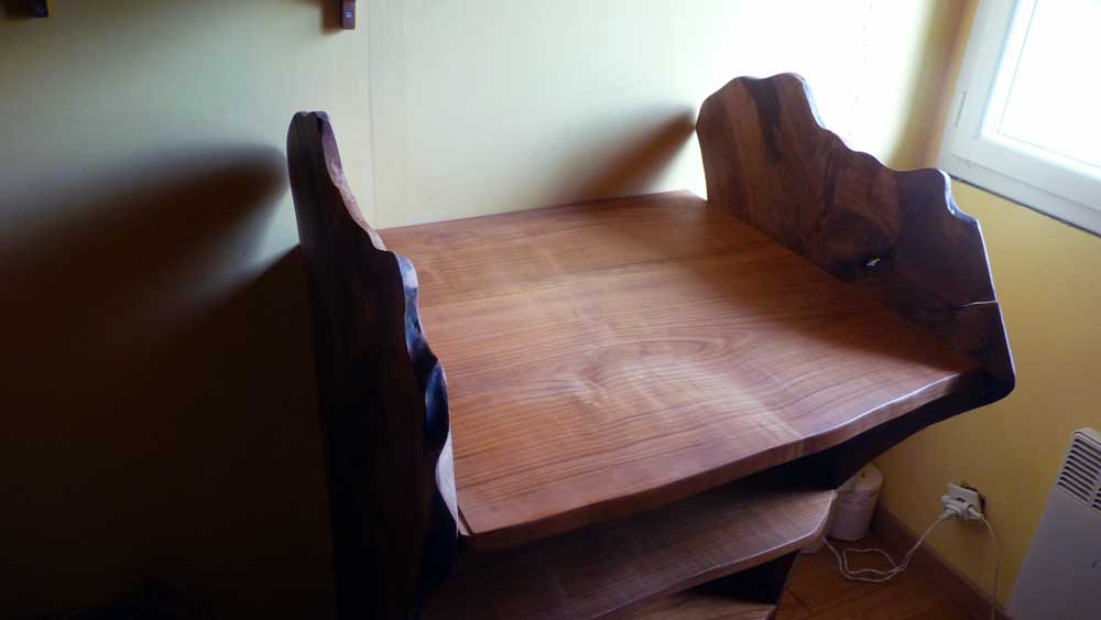 Pour la structure, les trois plateaux sont en merisier. L’assemblage ne comporte aucune visserie : il est réalisé à l’aide de queues d’aronde coulissantes usinées sur les plateaux, venant s’insérer dans les rainures des joues.
