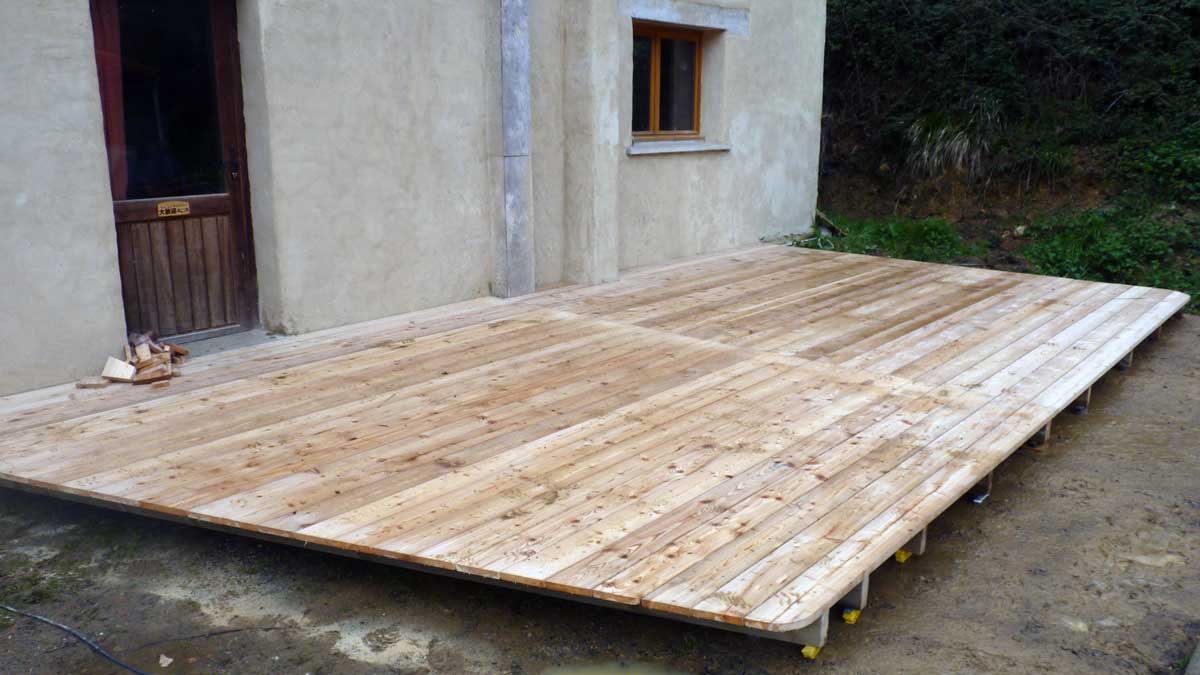 Ce chantier concerne la création d’une terrasse extérieure en Mélèze, une essence choisie pour son veinage marqué et sa résistance naturelle.