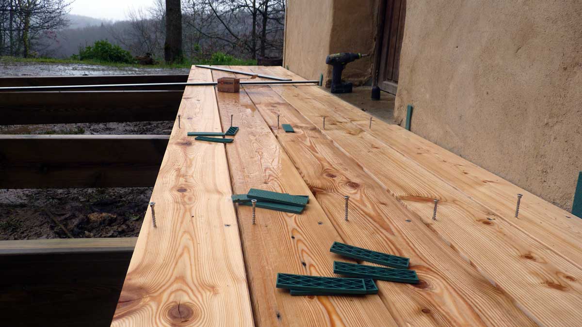 La longévité d’un tel ouvrage repose sur le respect de points de vigilance techniques. Le solivage a d’abord été mis en œuvre avec un espacement rigoureux, calculé notamment en fonction de l’épaisseur des lames, entre les solives pour assurer la stabilité globale dans le temps.